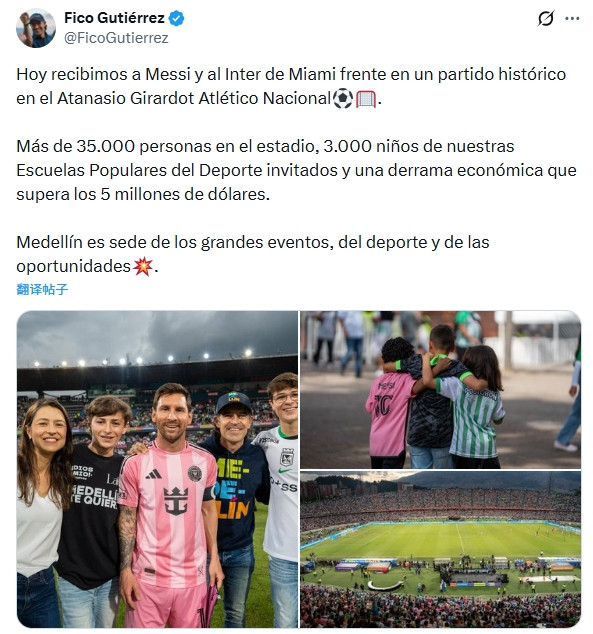 麦德林市长FicoGutiérrez在个人社媒晒出与梅西合影照片同时写道:“今天,梅西和迈阿密国际在吉拉多特球场与麦德林国民竞技进行一场历史性的比赛。